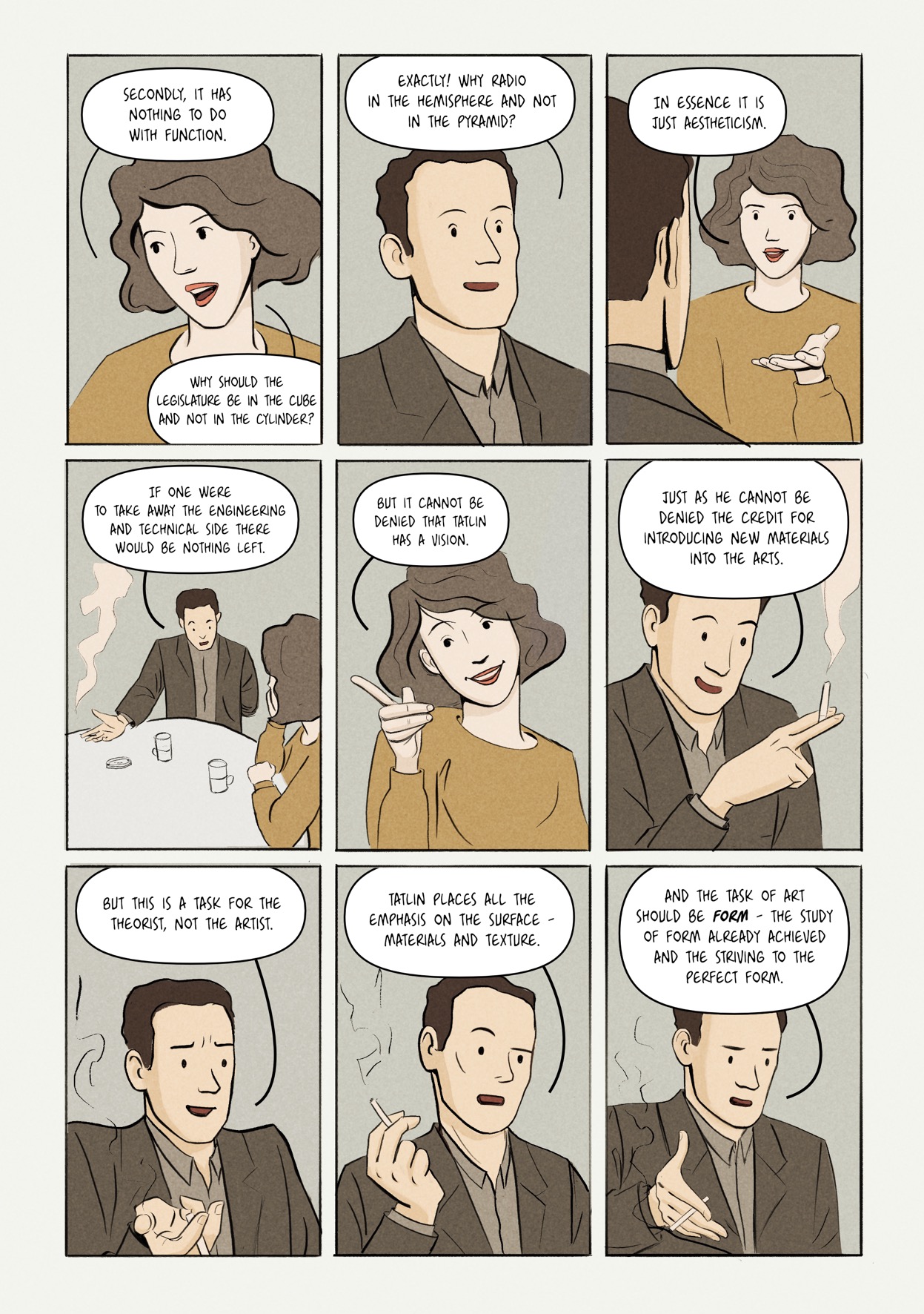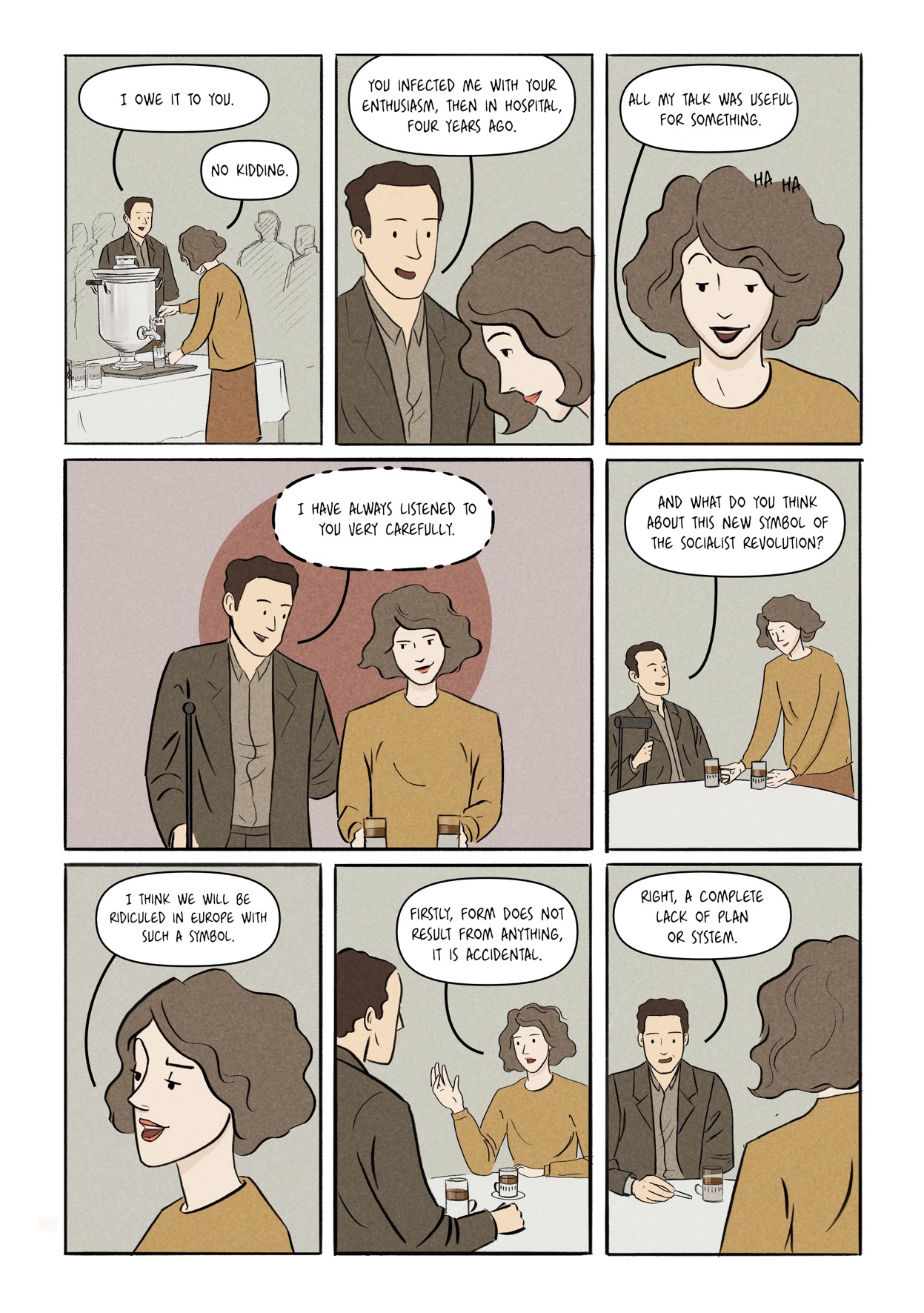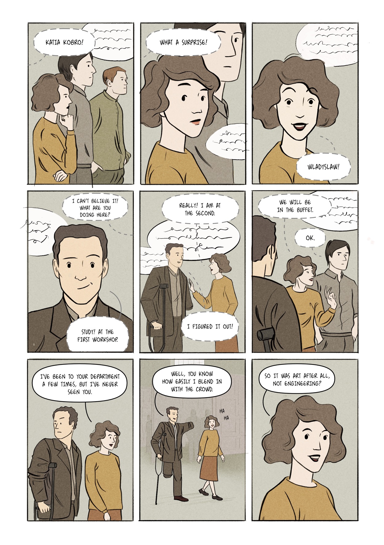 The comic was awarded 3rd prize at the 34th International Festival of Comics and Games in Łódź in 2023 as part of the Comic Album Treatment competition: In the opinion of the jury, this work stands out as an exceptionally successful biographical comic. It not only portrays the lives of two artists, Katarzyna Kobro and Władysław Strzemiński, but also offers insights into Polish art from the pre-war to the mid-20th century, as well as the systemic changes of the time. The author extremely skilfully intertwines motifs from the works of both protagonists into the events of their lives, while using a sparing drawing style for the story itself. The jury particularly appreciated the description of the competition entry, outstanding in terms of content, as well as the choice of demanding theme, characters and era. The story of the main character illluminates the clash between the need for individualism and the realities of the system, and thus also has a contemporary relevance.