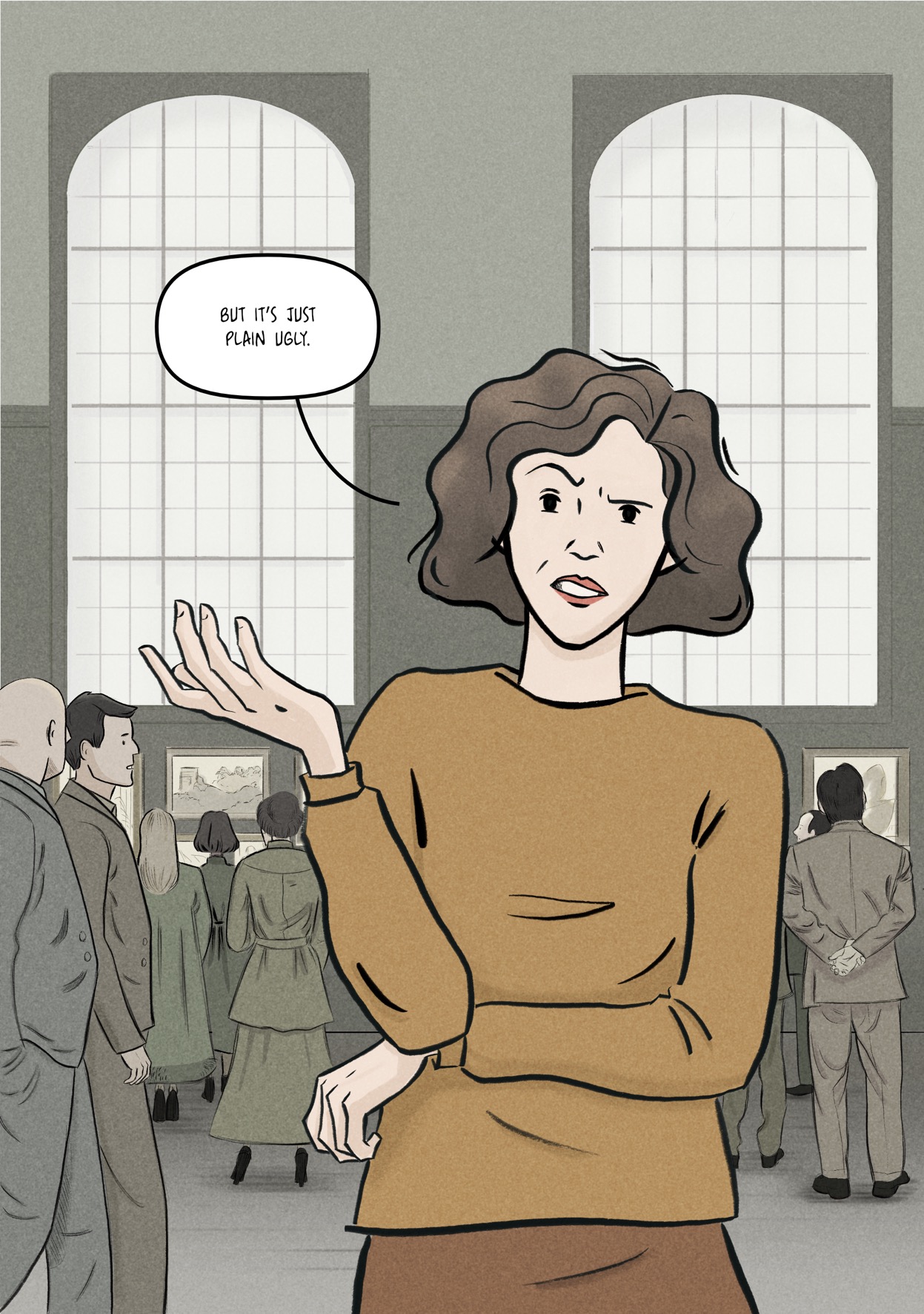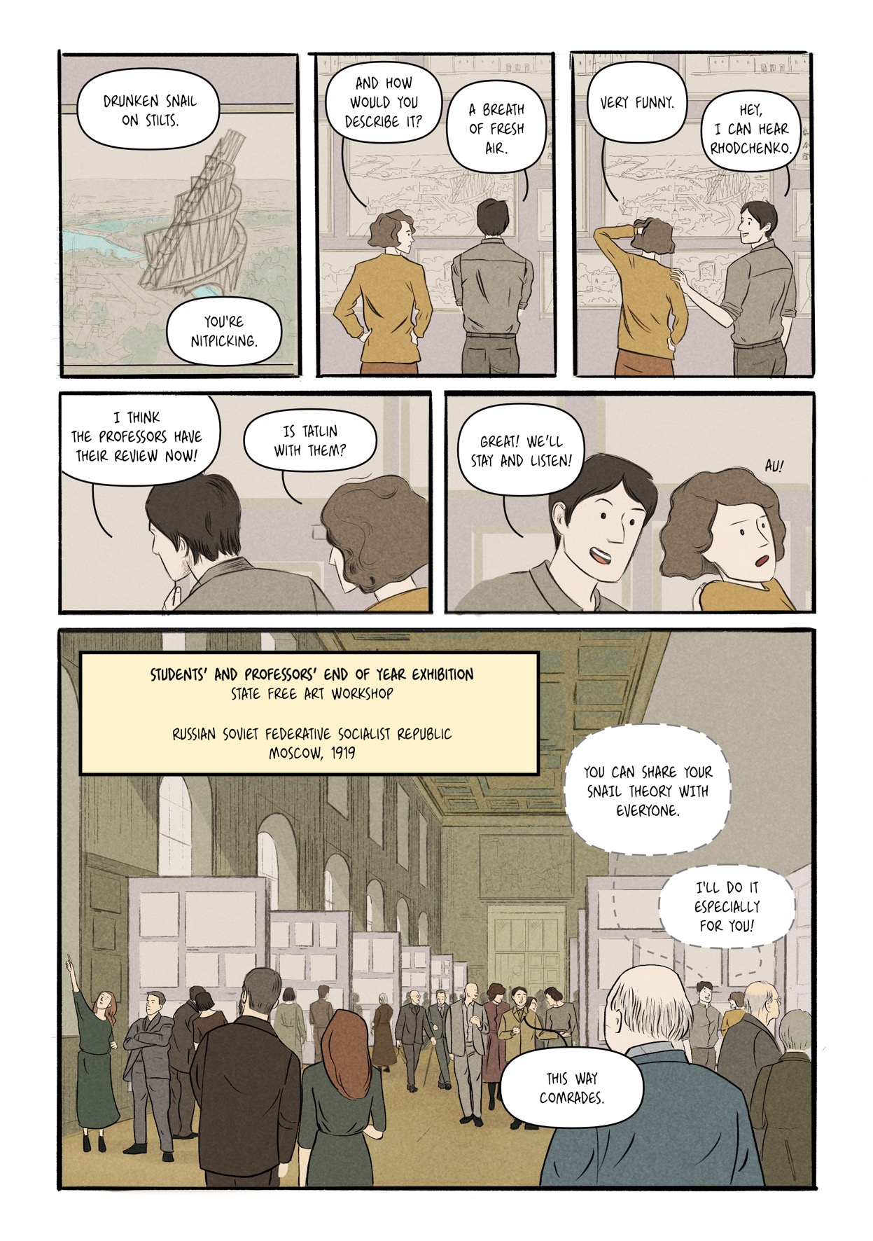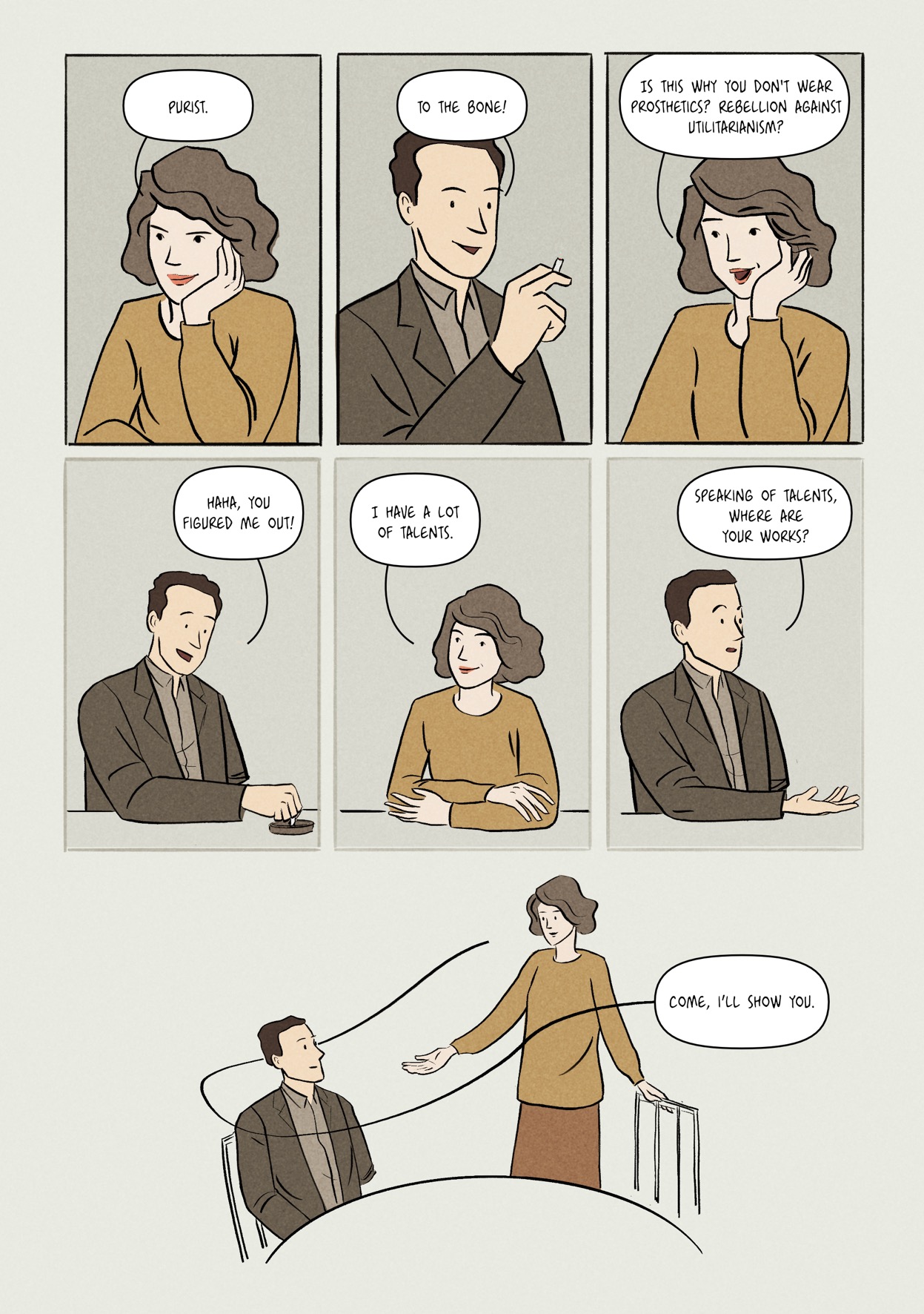 The comic was awarded 3rd prize at the 34th International Festival of Comics and Games in Łódź in 2023 as part of the Comic Album Treatment competition: In the opinion of the jury, this work stands out as an exceptionally successful biographical comic. It not only portrays the lives of two artists, Katarzyna Kobro and Władysław Strzemiński, but also offers insights into Polish art from the pre-war to the mid-20th century, as well as the systemic changes of the time. The author extremely skilfully intertwines motifs from the works of both protagonists into the events of their lives, while using a sparing drawing style for the story itself. The jury particularly appreciated the description of the competition entry, outstanding in terms of content, as well as the choice of demanding theme, characters and era. The story of the main character illluminates the clash between the need for individualism and the realities of the system, and thus also has a contemporary relevance.